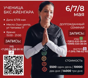 Легенда йоги, ученица Шри Б.К.С. Айенгара, Дэвки Десаи - преподаватель из Индии, проведет большой трехдневный семинар в Санкт-Петербурге.