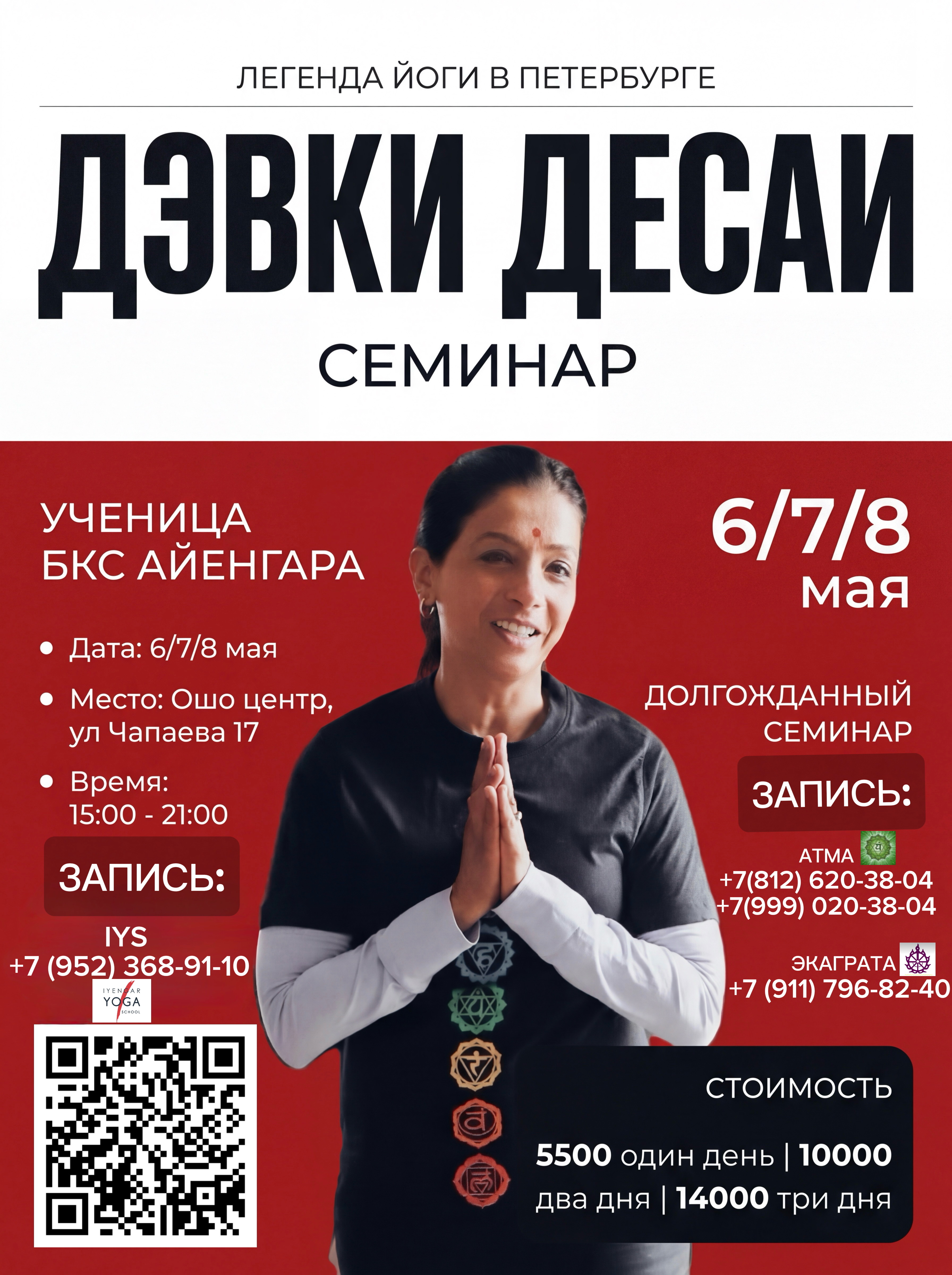 Легенда йоги, ученица Шри Б.К.С. Айенгара, Дэвки Десаи проведет большой трехдневный семинар в Санкт-Петербурге.